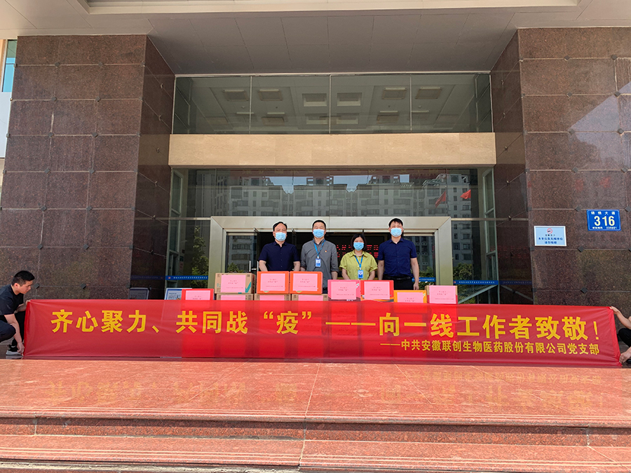 2022年5月6日,安徽聯(lián)創(chuàng)生物醫(yī)藥股份有限公司支部委員會向肥西經(jīng)開區(qū)抗疫一線單位捐贈物資,并向一直奮戰(zhàn)在新冠肺炎疫情防控一線的人員表達敬意和慰問。